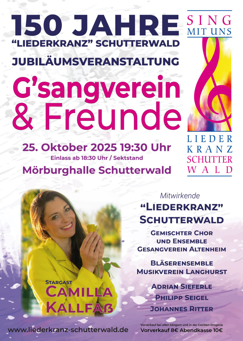 Anlässlich des 150-jährigen Jubiläums hat der Liederkranz zum Jubiläumskonzert eingeladen. Der Chor begrüßte seinen Stargast Marc Marshall mit Pianist René Krömer. Offenburger Tageblatt 22.07.2025, Von Manfred Vetter ,,Happy Birthday, lieber Liederkranz“: Das Festkonzert anlässlich des 150-jährigen Bestehens des Gesangvereins „Liederkranz“ Schutterwald war ein tolles Geburtstagsgeschenk für den Verein und seinen Chor mit Dirigent Stefan Jäger….